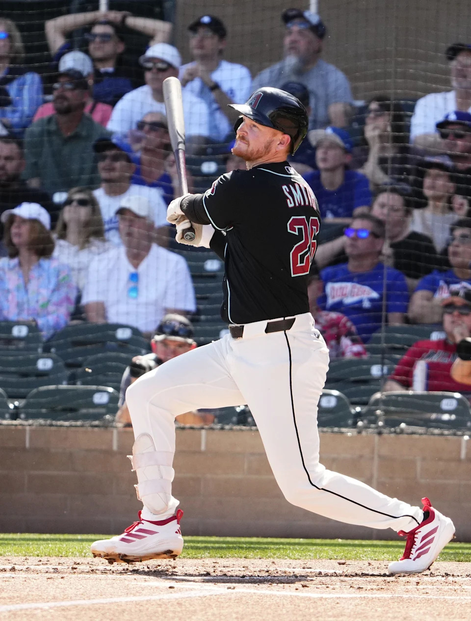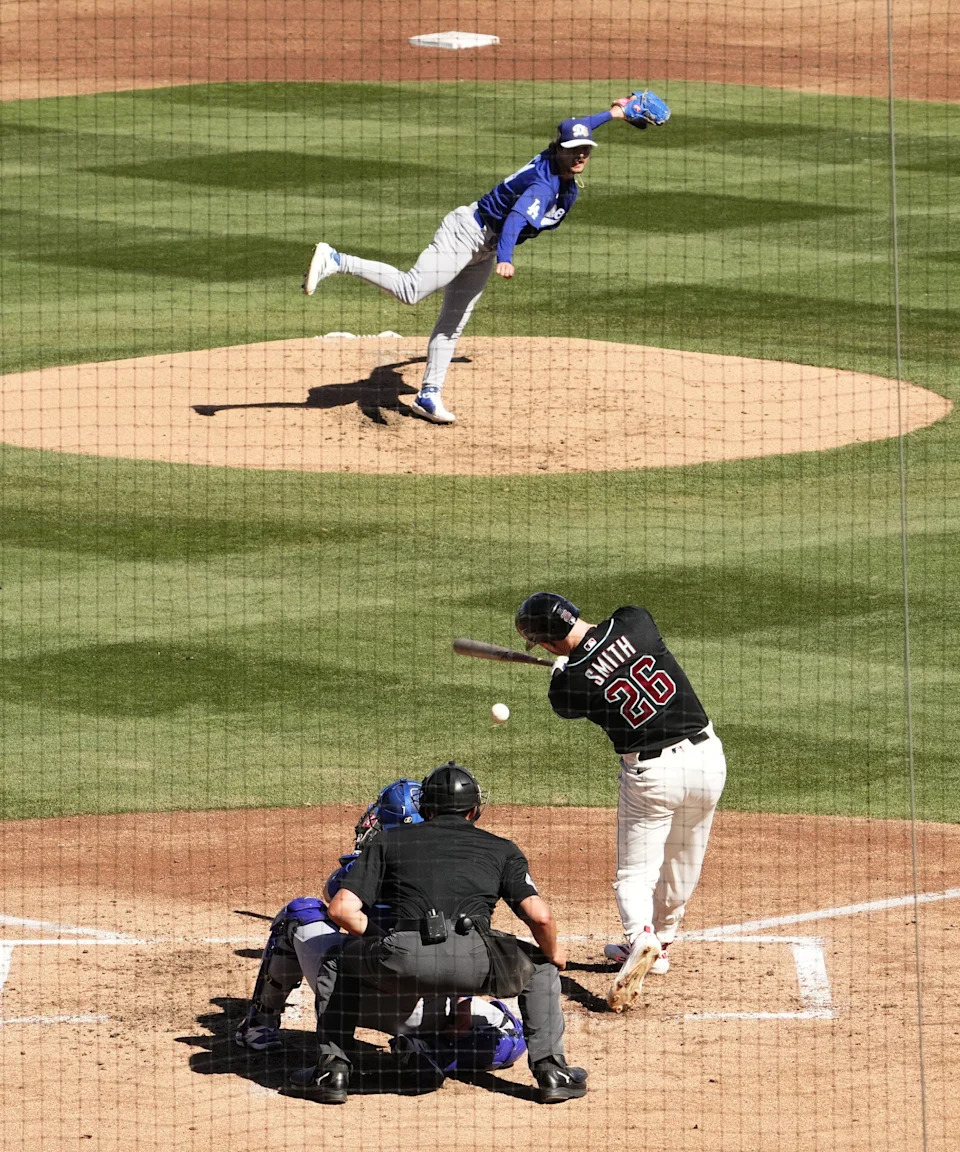 Arizona Diamondbacks’ Pavin Smith (26) lined out to center against the Los Angeles Dodgers in the first inning on Feb. 25, 2026, at Salt River Fields in Scottsdale.