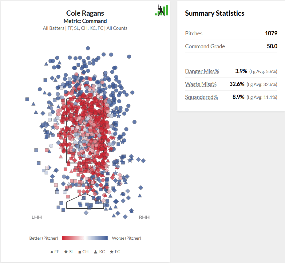 A danger miss is an in-the-zone pitch with low command and stuff scores, so it’s trying to measure meatballs. You can see Ragans is well below league average there. Waste misses, however, he is average in; a waste miss is a low-rated pitch outside the zone. Finally, we have “squandered,” which are pitches with good command and stuff ratings but outside the zone. All of these play into the overall command score there, a 50 on the 20–80 scale. Playing around with this, you can compare a player’s tendencies with different pitches in different counts or see if pitchers with high home run rates have correspondingly high danger miss percentages, and so on. For instance, Nestor Cortes had a high HR/9 last year, but not because he was throwing meatballs. Anthony Molina’s high HR/9, however, was in part due to a much higher-than-league-average 7.6% danger miss rate. In particular, his fastball and slider had rates above 8%. Go think of your own things to play with here and put them in the comments.