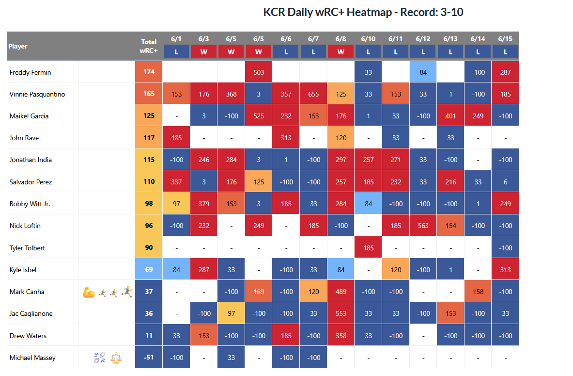 It’s kind of fun, maybe not my sort of thing. Freddy Fermin had the highest total wRC+ but only played in five of the games. Their analysis tool – I didn’t show the legend below – has Mark Canha “carrying the team,” as denoted by a beefy arm, so I’m not sure that part is dialed in yet. Michael Massey as the weak link checks out a bit more, though he did not play much. You can change it to a line graph version, and you can do OPS, AVG, OBP, SLG, K%, or BB% instead of wRC+.