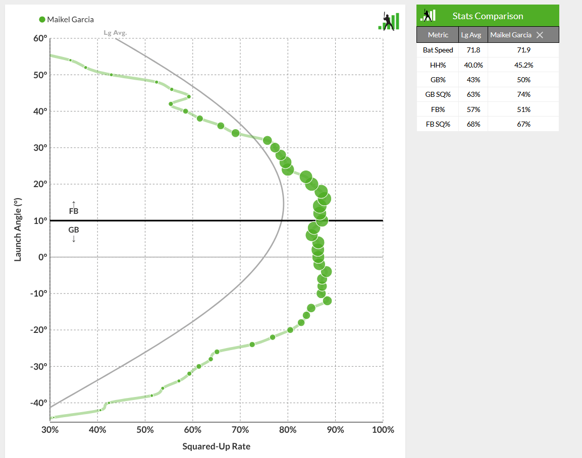 The gray curve is league average, so anywhere the green is outside the curve, Garcia is squaring up balls at an above-league-average rate. For him, that is basically anything below 33 degrees. If his launch angle gets above that, it’s not great. He clearly thrives in a launch angle between -10 and 22 degrees. You can overlay multiple players to see how they compare, both in where and how often they’re squaring things up. Maikel Garcia has a high rate on the x-axis here even compared to Bobby Witt Jr. or Vinnie Pasquantino, and there are some differences in the launch angles at which different players make solid contact. You can smooth the player curves and add the ideal home run band across it too (from 20 to 35 degrees). I do think adding some more layers would be helpful. If you could map average launch speeds and outcomes to each of the dots, it would be interesting. Right now, when you mouse over the dots, it gives you the coordinates plus something that says “% of balls,” though I do not know what that means. I also think being able to isolate home runs, doubles, fly outs, etc., on the coordinate plane could be fun, but that might be a separate tool.