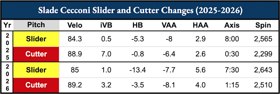 Above shows the difference in movement patterns between Cecconi’s slider and cutter from 2025 to his first outing in the Spring. Cecconi’s cutter got him into quite a bit of trouble when he used it last season. It often turned into a cement mixer and hovered in the middle of the plate far too often, getting barreled at a 20% rate. In his outing on Wednesday, Cecconi’s cutter worked along an axis identical to his 4-seam (1:15), finding a more stable horizontal axis. His slider also generated nearly three inches more glove-side break with less induced vertical break.