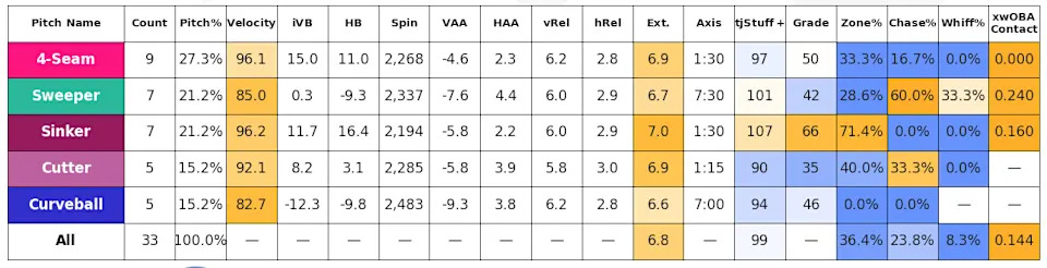 First outing saw better command with swing and miss on slider