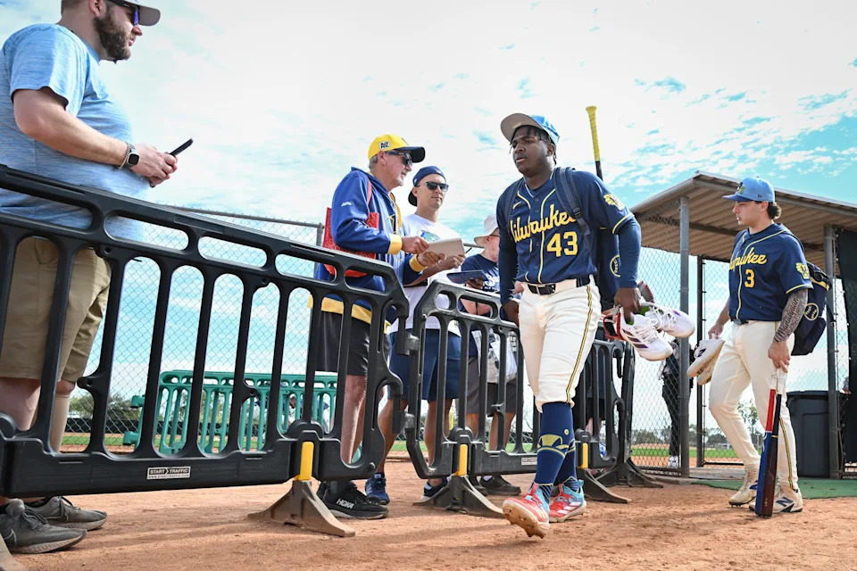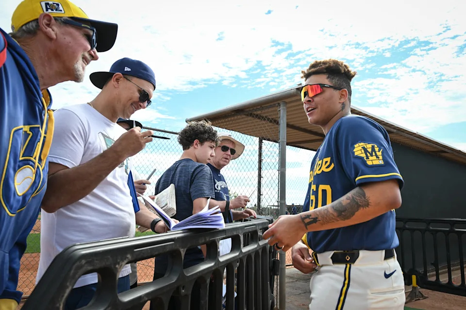 Milwaukee Brewers infield prospect Brady Ebel signs an autograph for a fan during spring training workouts Sunday, February 15, 2026, at American Family Fields of Phoenix in Phoenix, Arizona.