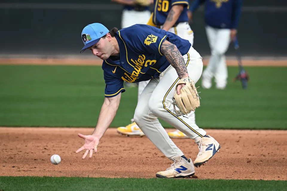 Milwaukee Brewers infeilder/outfielder Greg Jones fields a ground ball during spring training workouts Monday, February 16, 2026, at American Family Fields of Phoenix in Phoenix, Arizona.