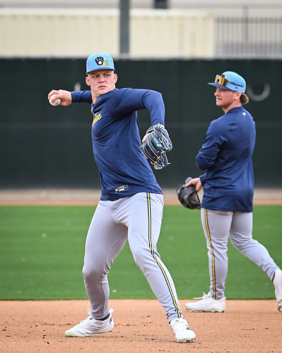Brewers third base prospect Andrew Fischer throws to first base during spring training workouts Sunday, February 15, 2026, at American Family Fields of Phoenix in Phoenix, Arizona.