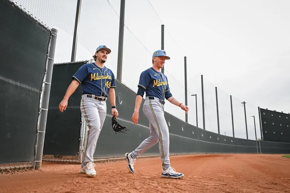 Milwaukee Brewers pitching prospects Bryce Meccage, left, and Tanner Perry walk onto the field during spring training workouts Monday, February 16, 2026, at American Family Fields of Phoenix in Phoenix, Arizona.