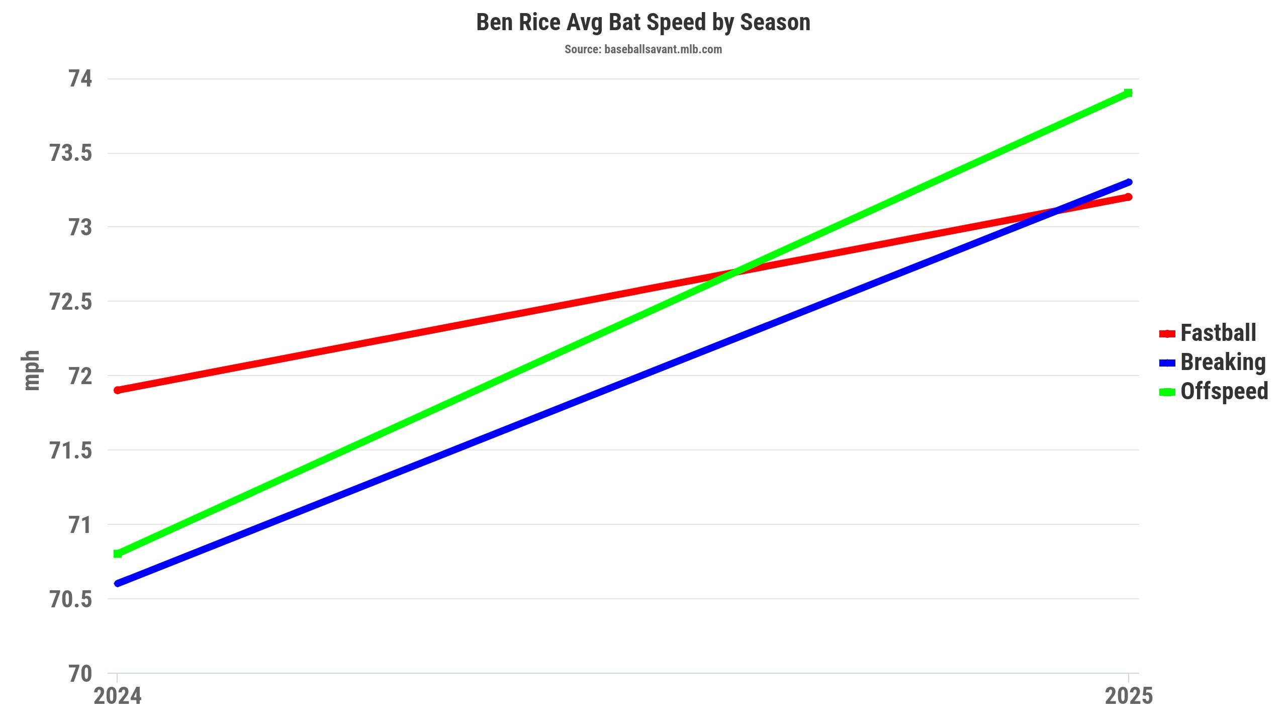 Rice barrels up the ball regularly, with a 10.5 percent barrel rate per plate appearance, over double the league average. He boasts solid plate discipline with an 89 percent zone contact rate, nearly four percentage points above the league norm. Meanwhile, Rice shows a patient approach and doesn’t chase, with a 21.2 percent chase rate that’s almost seven points below the league average.