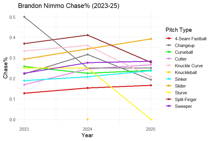 Things have changed with respect to how Nimmo’s approach at the plate has worked. Nimmo has long been great at working counts and getting on base via the walk. However, since Nimmo moved from a leadoff man to a middle-of-the-order hitter, the ex-Met became more aggressive at the plate, expanding more on fastballs and breaking balls by and large.