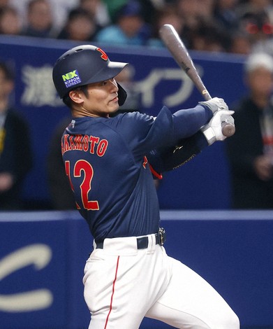 Seishiro Sakamoto hits a game-tying single for Japan in the fifth inning of a warm-up game against the Chunichi Dragons at Vantelin Dome Nagoya on Feb. 28, 2026. (Kyodo)