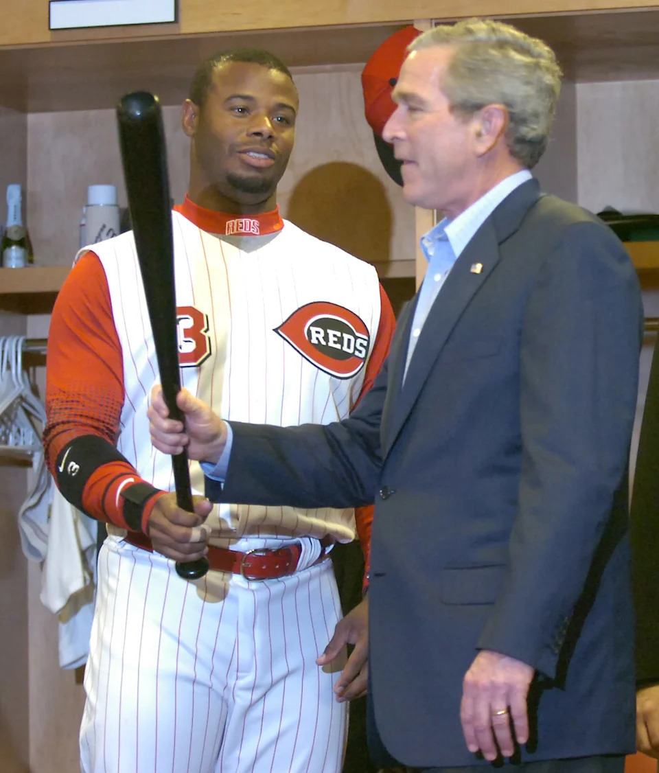 April 3, 2006: Ken Griffey Jr. talks about his bat with President George W. Bush during a clubhouse visit. The Cincinnati Reds played host to the Chicago Cubs at Great American Ball Park. Bush, a guest of Reds CEO Bob Castellini, threw out the ceremonial first pitch.