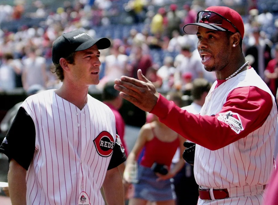 Ohio native, actor Luke Perry talks with the Reds’ Ken Griffey Jr. before Perry read Lou Gehrig’s farewell speech prior to the Reds’ game against the Atlanta Braves on June 1, 2002.
