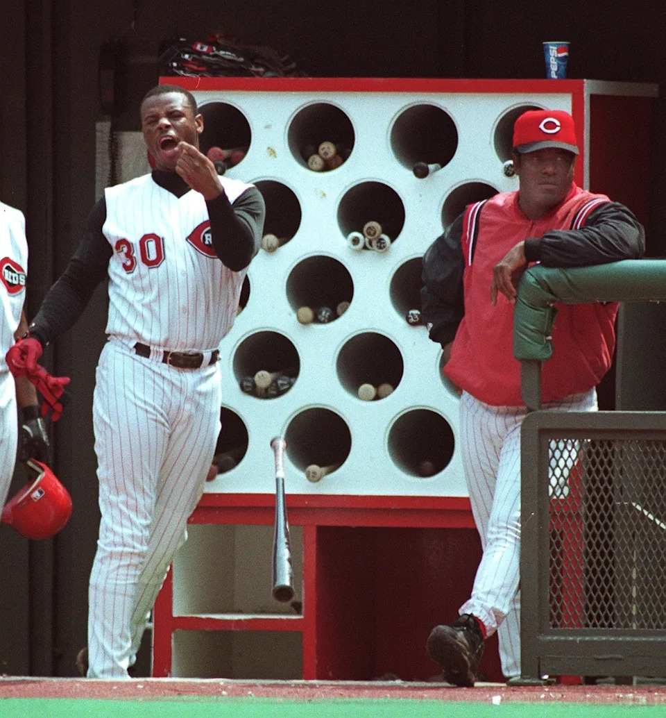 June 9, 2000: Reds outfielder Ken Griffey Jr. tosses a bat from the rack onto the field following his ejection in the eighth inning against Cleveland. His father Ken Sr. is on the right.