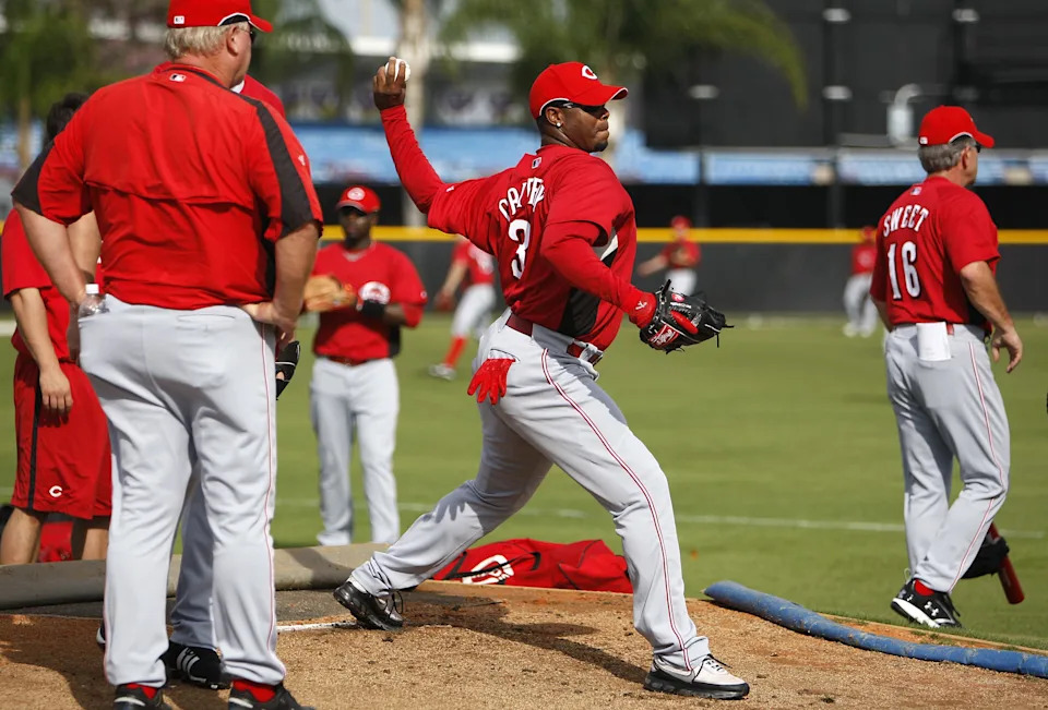 February 14, 1998: Reds players Damian Jackson, left, and Reggie Sanders play around during a pepper drill during the first day of Reds spring training workouts at the Sarasota Sports Complex.