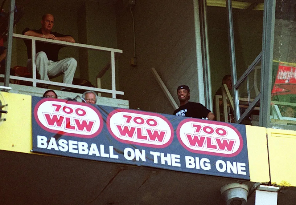 September 3, 2000: Reds center fielder Ken Griffey Jr. was out of the lineup and into the WLW broadcast booth during the eighth inning. Visible, (second from the left/foreground) is announcer Marty Brennaman, who earlier criticized Griffey for not hustling.