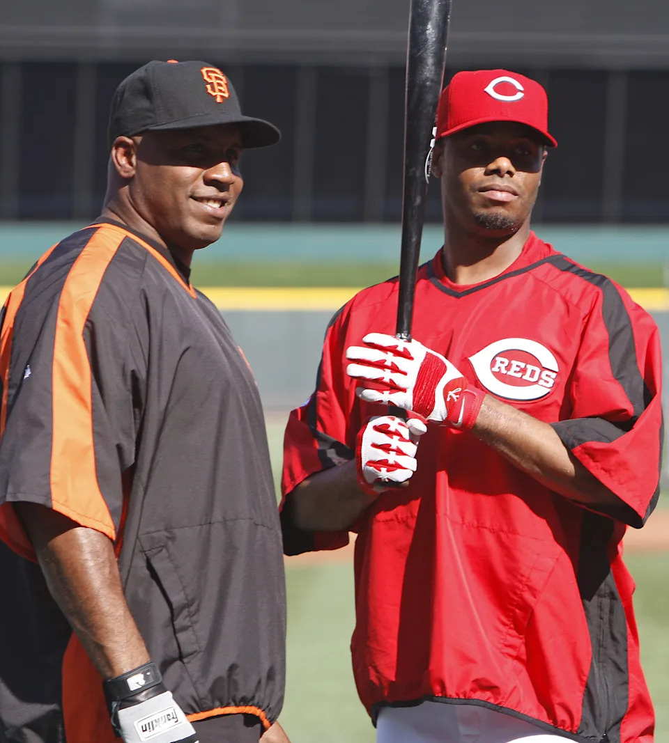 Cincinnati Reds outfielder Ken Griffey Jr. and the Giants outfielder Barry Bonds hang out during batting practice at Great American Ball Park on July 3, 2007.
