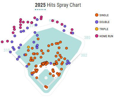 In his age-33 season last year, Contreras was in the top-20 percentile in Barrel % and Hard Hit%, as well as the top-5 percentile in Bat Speed, a great sign for an aging hitter, and likely why the Red Sox felt comfortable committing to him for two seasons. Additionally, his spray chart shows that the Monster in left should be inviting for Contreras to build on his 52 extra-base hits (31 doubles) from a year ago: