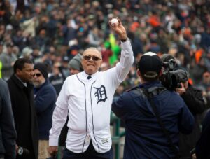 Willie Hernandez holds up the ball before throwing the ceremonial pitch during Detroit Tigers Opening Day game against the Kansas City Royals at Comerica Park on Thursday, April 4, 2019. Credit: © Mandi Wright, Detroit Free Press