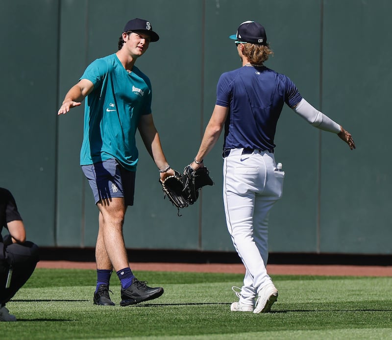 Seattle Mariners pitcher Bryce Miller meets one of the team’s two new draft picks, Ryan Sloan, during batting practice Tuesday, July 23, 2024, at T-Mobile Park in Seattle. (Dean Rutz/The Seattle Times/TNS)