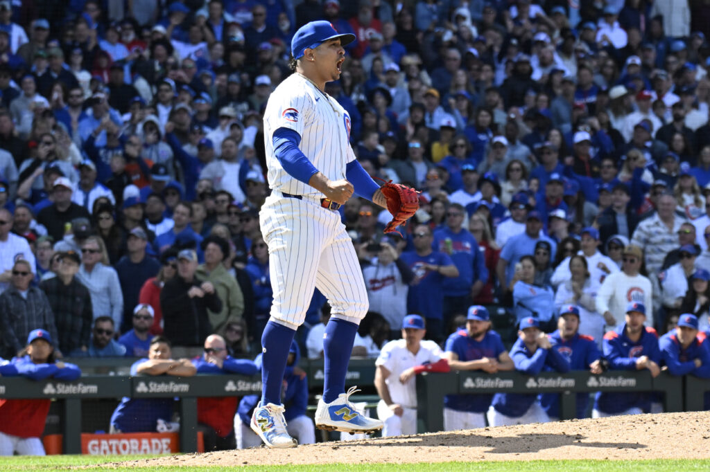 May 31, 2025; Chicago, Illinois, USA; Chicago Cubs pitcher Daniel Palencia (48) reacts after the game against the Cincinnati Reds at Wrigley Field. Mandatory Credit: Matt Marton-Imagn Images