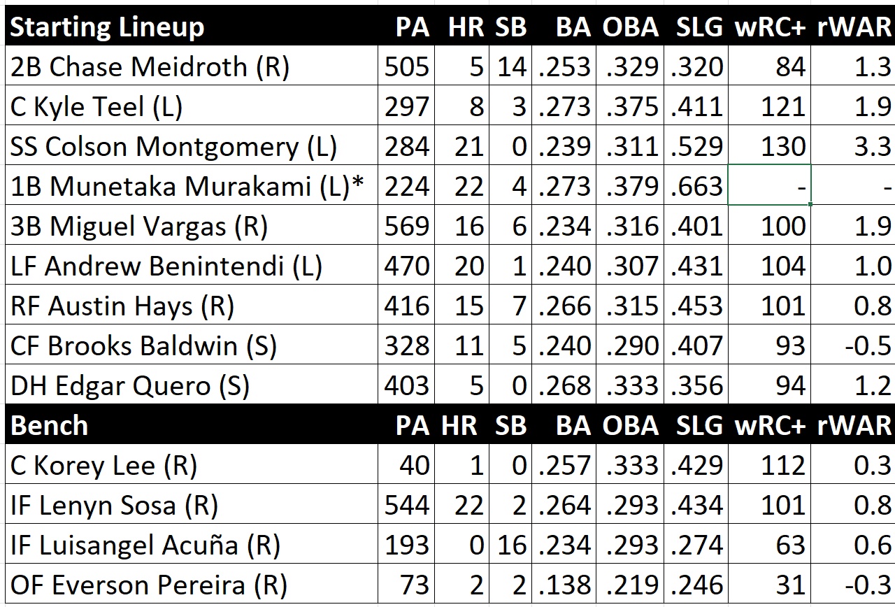 Munetaka Murakami battled oblique injuries last year, but still smashed 22 home runs in just 56 games. Andrew Benintendi bounced back from two disappointing seasons to be a league-average hitter, although his defense in left is quite poor now. Austin Hays is a lefty masher Royals fans were hoping to bring in, but he’ll do his damage from the South Side of Chicago.