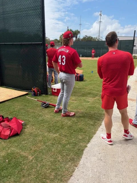 Fitts and Zimmerman threw bullpens, as well. I see on the schedule that Lin was to throw off the NewtForce mound (which is inside the MiLB batting cage building). I have inquired about what this is, exactly. On Franklin, I’ve seen some pundits suggest he might be the steal of the 2025 draft, or something like that. Watching him throw BP, I can see why someone might say that.