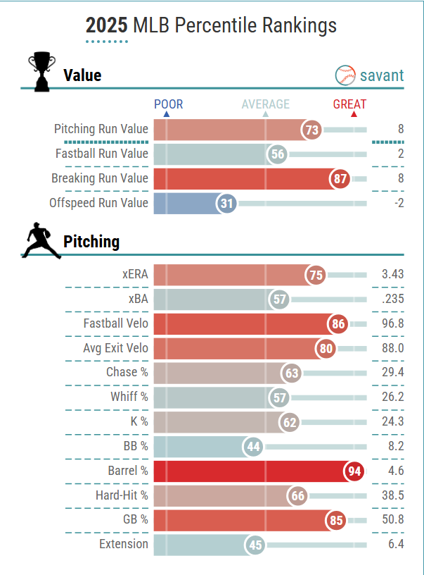 I love seeing that ground-ball rate up over 50%, and the low hard-hit% and barrel% (4.6% is elite) are excellent batted-ball metrics in their own right.