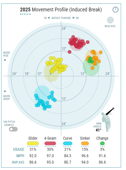 Something I want to watch closely with Rodriguez is his fastball velocity and shape. Rodriguez is a hard-thrower, averaging 97.4 mph in 2023, though that dipped to 96.1 mph in 2024. He was averaging 96.1 mph in his first spring start on 2/24/26, and even touched 98 mph. We’ll also want to pay close attention to his fastball shape. Rodriguez never had exceptional IVB, but he averaged 12.7 inches of arm-side movement with his four-seamer in 2024, giving it a unique shape on top of the plus velocity.