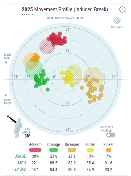He rounds out his repertoire with a sweeper, slider, and sinker, and the two breaking pitches performed well last season. The sweeper was especially strong, with batters hitting .194 with a .286 SLG and .224 Woba against, as well as a 26.7% whiff rate. The sweeper has 4.7 inches of drop and 13 inches of glove-side movement, making it a pitch with a unique shape as well.