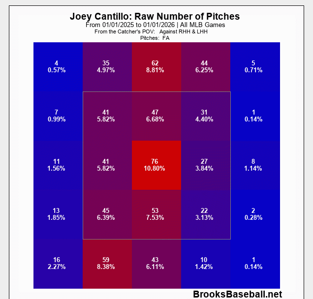 It sort of lines up with the MLB average, which is not where you want to be with a 91 mph fastball. Cantillo was kind of all over the place with his fastball in 2025, have a look at his four-seam heatmap.