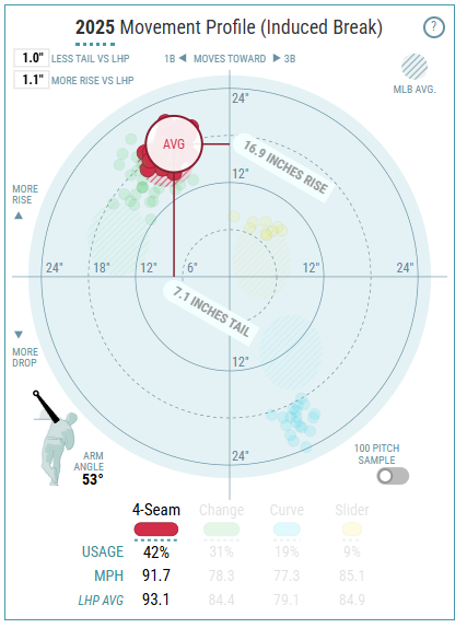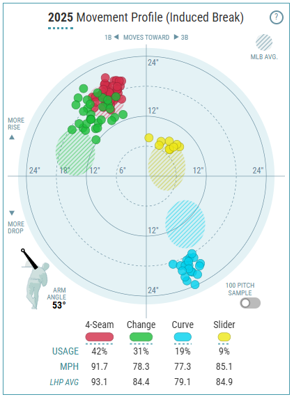 An 83.1 mph offering, there is a big velocity gap between the changeup and fastball. A 13 mph gap is perfect for a changeup like this, because it’s not hard enough for the hitter to adjust, and it’s not soft enough for a hitter to read early. The changeup also has plus movement with two inches of rise and 12.2 inches of arms-side run. Here’s an example of the pitch from 2024.