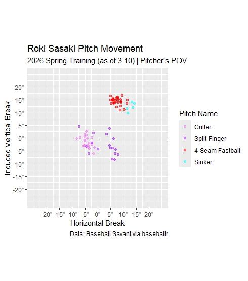 Sasaki has changed up his arsenal this year, adding in a cut/slider, as opposed to the slider with sweep that he used in 2025. However, hitters have been on the fastball this season. That fastball, for what it’s worth, has been sitting 96-98 MPH in the spring.