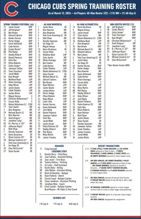 Chicago’s Spring Training roster of 46 players consists of 25 pitchers (five non-roster invitees), four catchers (one non-roster invitee), 10 infielders (four non-roster invitees) and seven outfielders (three non-roster invitees).