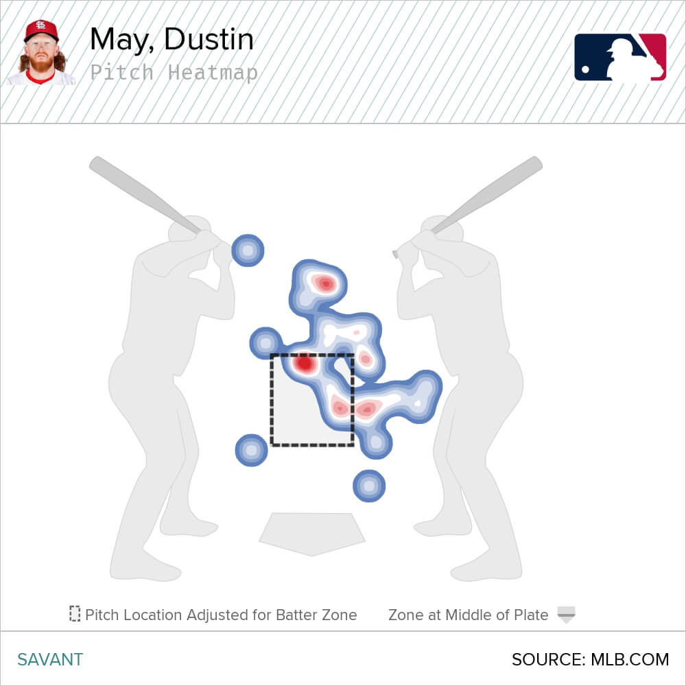 May’s velocity is up almost three ticks, which is enough to expect him to have better velocity this year than last. His changeup is harder. He’s brought the curveball out of the dustbin. He almost has two more inches of ride on the four-seamer, which is a pitch that was a differentiator for him when he was at his best.
