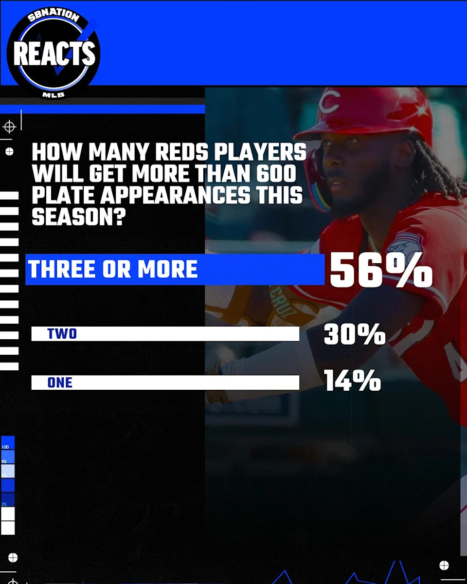 Those three things sure appear to be the fixed tenets on this otherwise malleable, flexible roster. So, it’s not a surprise that when I asked you earlier this week how many Cincinnati Reds hitters would top the 600 PA mark in 2026, you overwhelmingly responded with 3…or more.