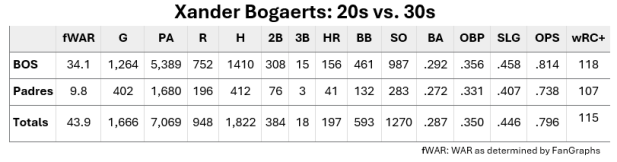 Bogaerts’ time with the Padres began in his age-30 season. And over the past three seasons with them, he is batting 20 points lower, reaching base almost 10% less and getting an extra-base hit slightly more than half as often as he did while spending the entirety of his 20s with the Boston Red Sox.