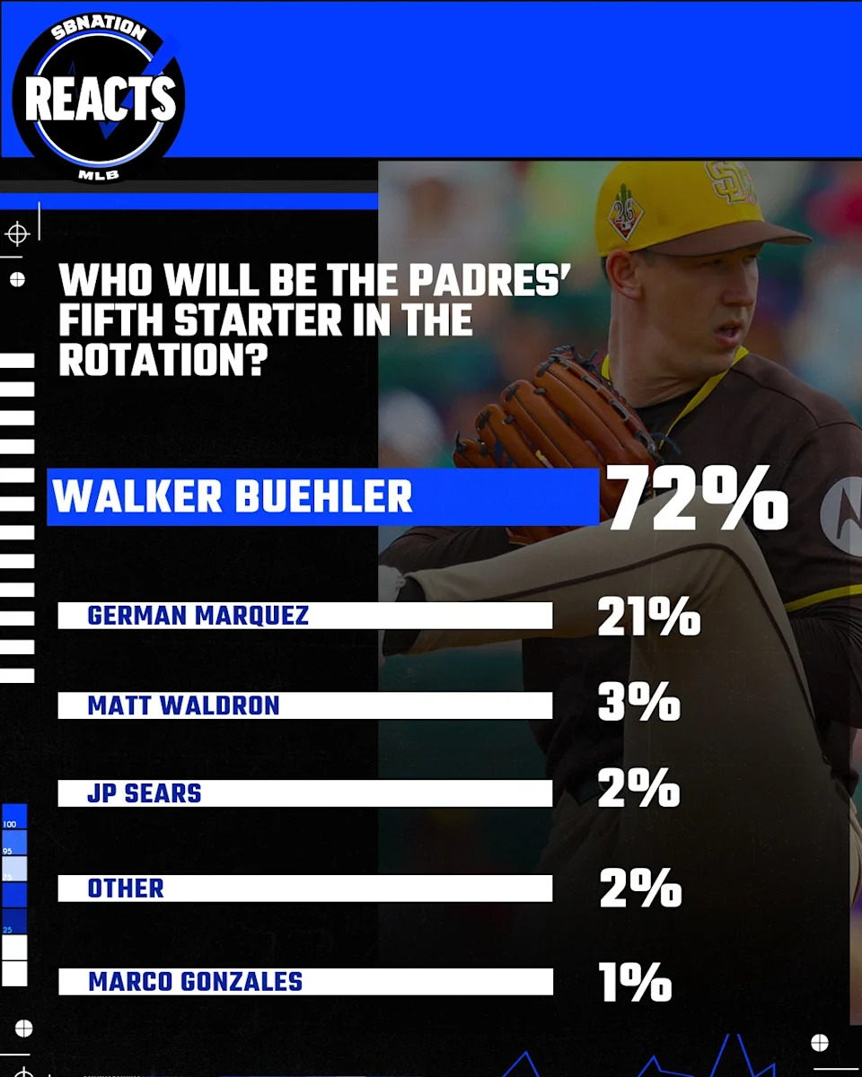The Padres Reacts Survey on Gaslamp Ball this week asked respondents to select who they thought would win the final spot in the rotation and the overwhelming majority said Buehler. He has been the most consistent of the group competing for the job and his track record, despite multiple arm surgeries, says he knows how to pitch in the big leagues and can be successful.