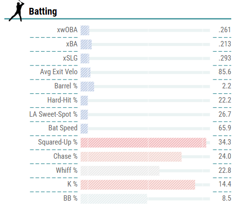 Now, based on his past numbers in the minors, that is probably not in the cards too much. He has never been known as a bat first prospect, relying on sparkline defense to carry him to the major league and that was pretty much the case. He’s an excellent defender behind the plate, but anemic when hitting. His Statcast data is, frankly, scary to behold.