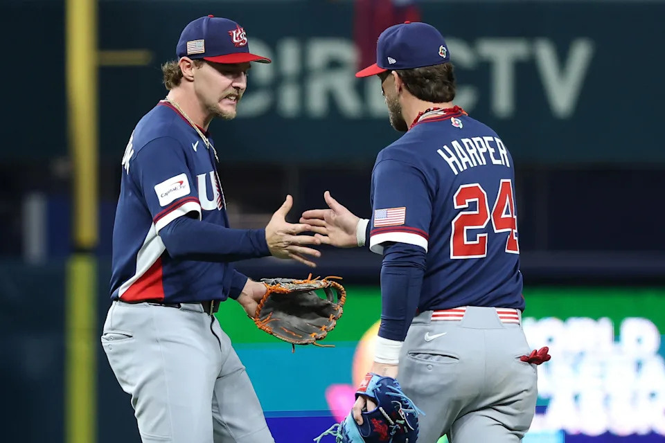 MIAMI, FLORIDA – MARCH 15: Gunnar Henderson #11 and Bryce Harper #24 of Team United States celebrate after the 2-1 victory against Team Dominican Republic at loanDepot park on March 15, 2026 in Miami, Florida. (Photo by Al Bello/Getty Images)