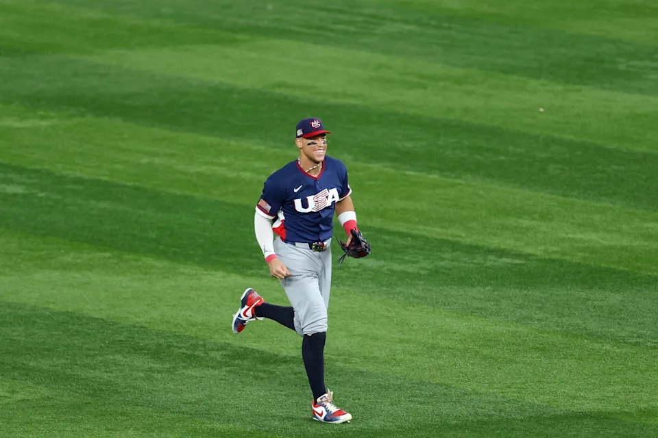 MIAMI, FLORIDA – MARCH 15: Aaron Judge #99 of Team United States looks on from the dugout after the 2-1 victory against Team Dominican Republic at loanDepot park on March 15, 2026 in Miami, Florida. (Photo by Al Bello/Getty Images)