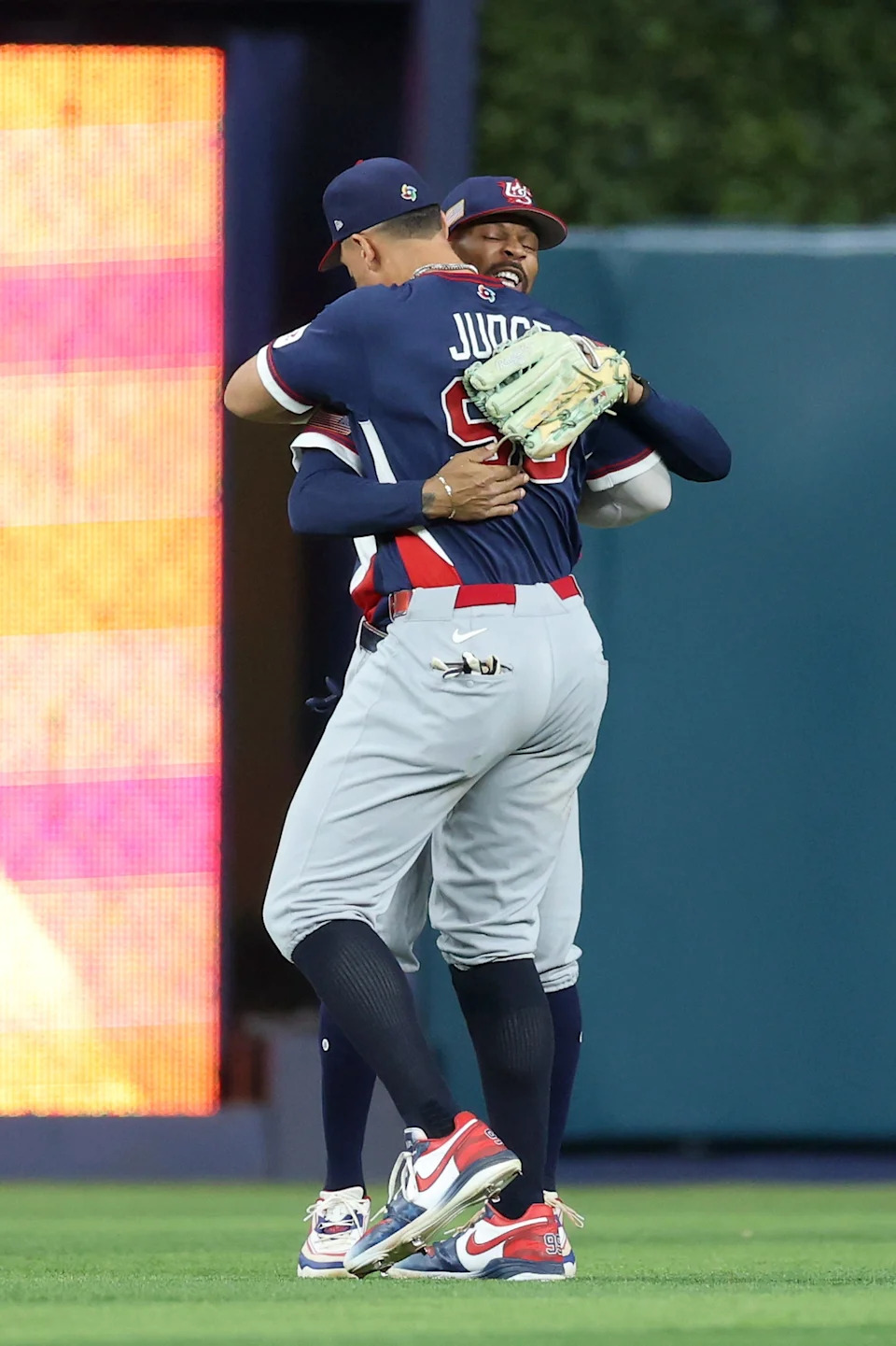 MIAMI, FLORIDA – MARCH 15: Byron Buxton #25 and Aaron Judge #99 of Team United States embrace after the 2-1 victory \ at loanDepot park on March 15, 2026 in Miami, Florida. (Photo by Al Bello/Getty Images)