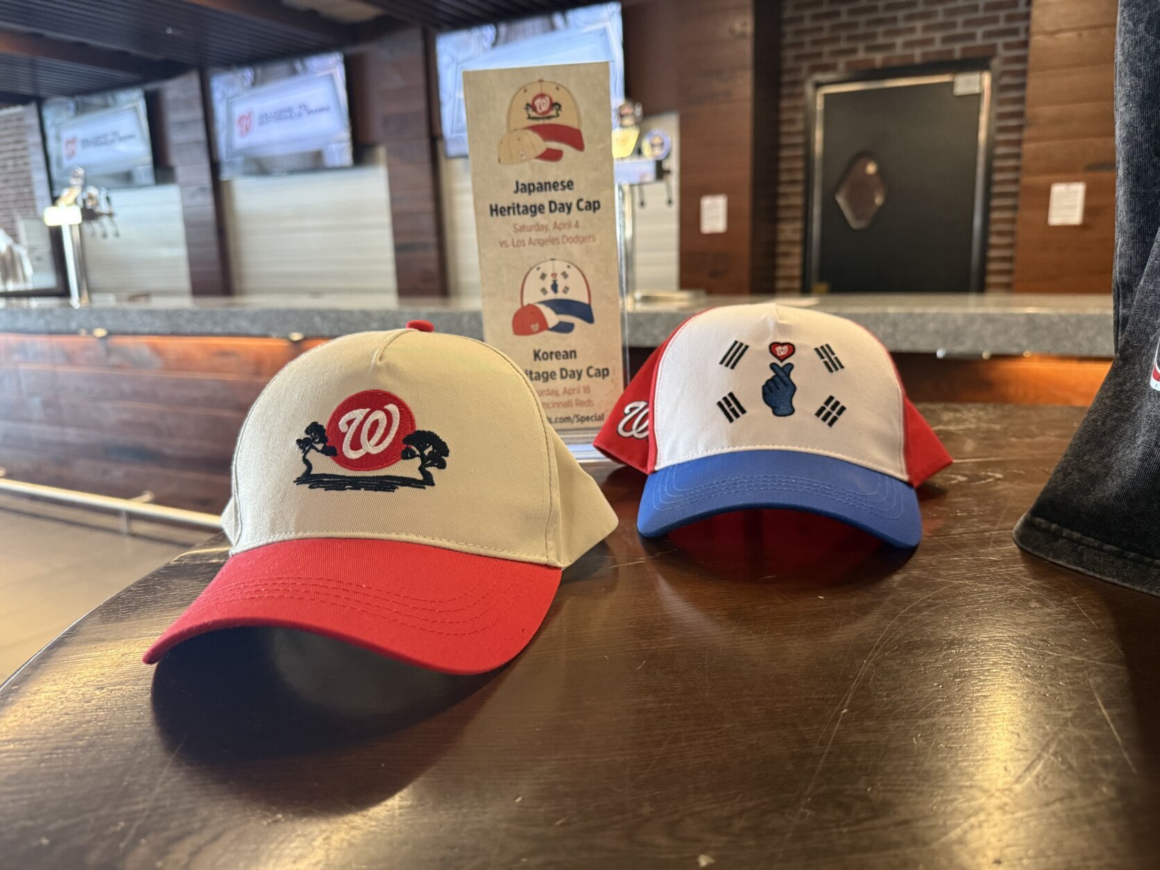 Washington Nationals baseball hats from the team’s Korean Heritage Day celebration.