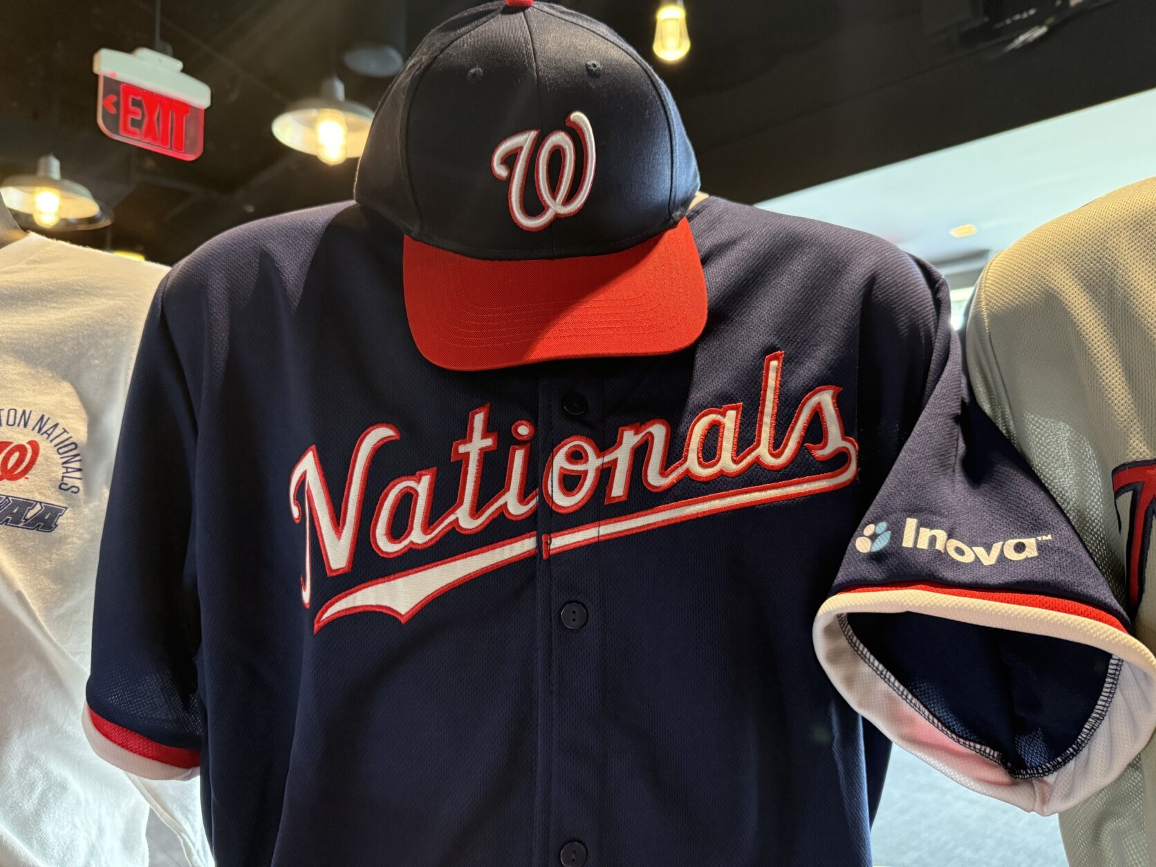 The standard navy blue and red Washington Nationals jersey and hat.