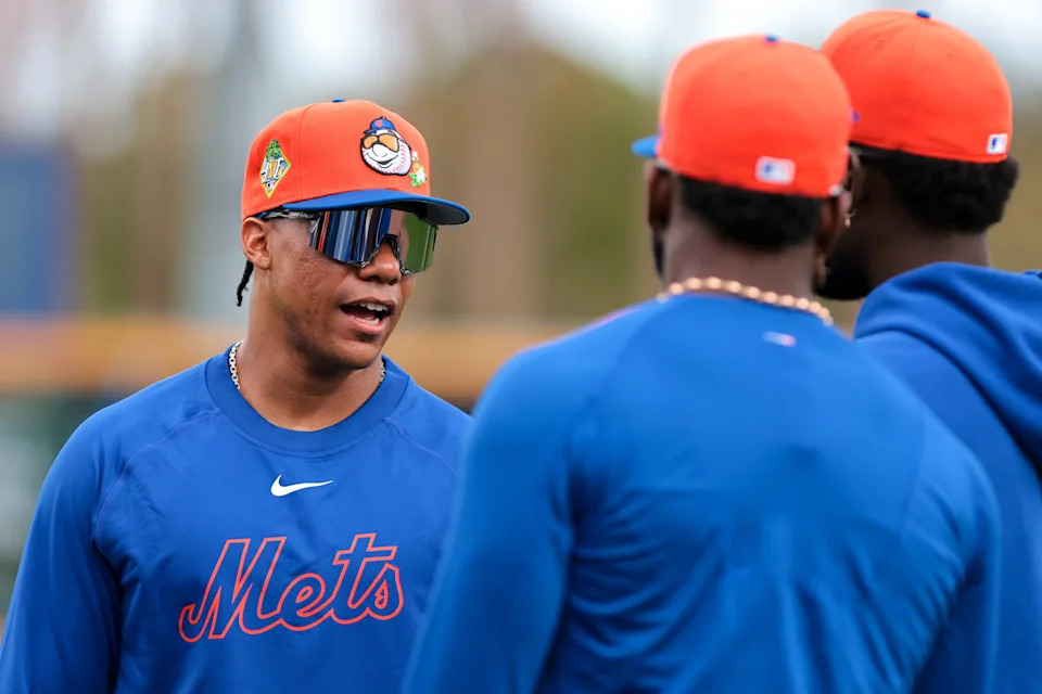 Feb 17, 2026; Port St. Lucie, FL, USA; New York Mets outfielder Juan Soto (22) speaks to outfielder Luis Robert Jr. (88) and infielder Ronny Mauricio (0) during spring training at Clover Park. Mandatory Credit: Sam Navarro-Imagn Images