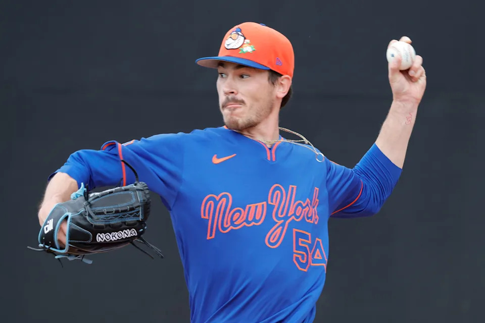 Feb 17, 2026; Port St. Lucie, FL, USA; New York Mets pitcher Sean Manaea (59) works during spring training at Clover Park. Mandatory Credit: Sam Navarro-Imagn Images