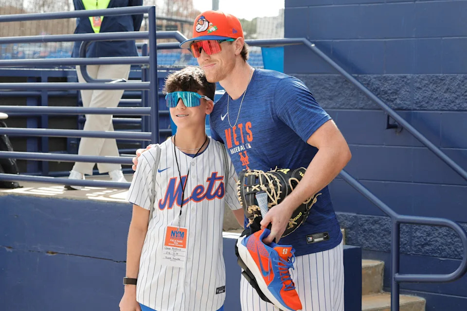 Feb 17, 2026; Port St. Lucie, FL, USA; New York Mets third baseman Brett Baty (7) poses with Chase Kaldawy a fan visiting from Connecticut during the spring training workouts at Clover Park. Mandatory Credit: Reinhold Matay-Imagn Images