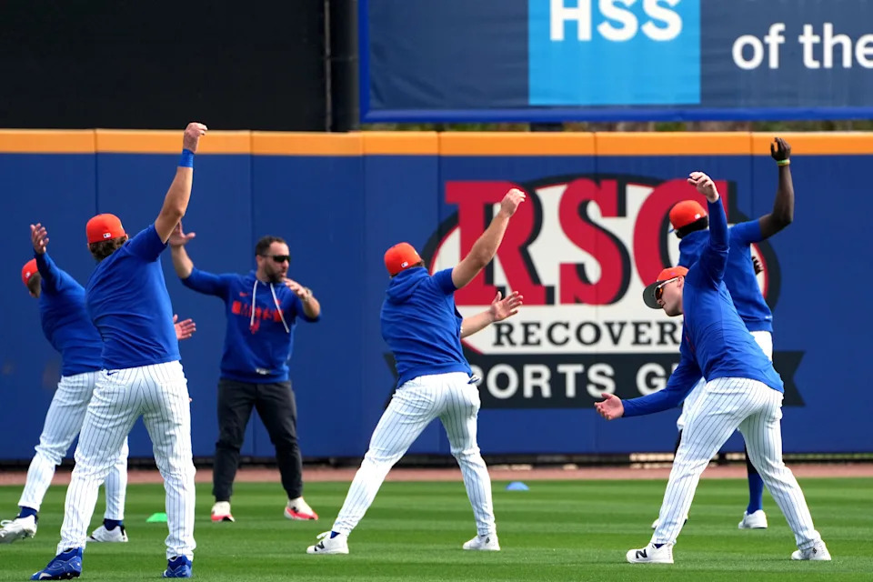 Feb 16, 2026; Port St. Lucie, FL, USA; New York Mets warm-up during spring training. Mandatory Credit: Jim Rassol-Imagn Images