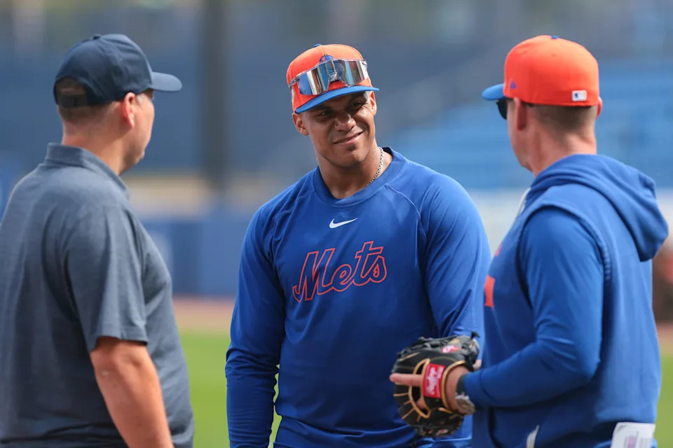 Feb 17, 2026; Port St. Lucie, FL, USA; New York Mets outfielder Juan Soto (22) speaks to managers Carlos Mendoza (right) and assistant general manager Eduardo Brizuela (left) during spring training at Clover Park. Mandatory Credit: Sam Navarro-Imagn Images
