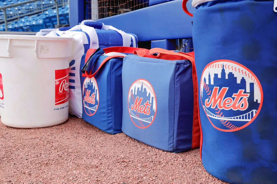 Feb 17, 2026; Port St. Lucie, FL, USA; Gear bags full of baseballs await the players during the New York Mets spring training workouts at Clover Park. Mandatory Credit: Reinhold Matay-Imagn Images