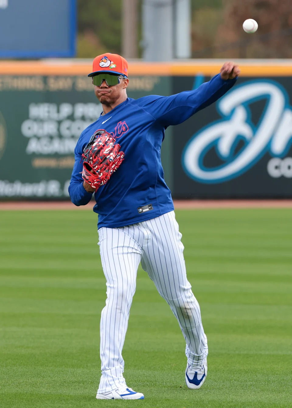 Feb 17, 2026; Port St. Lucie, FL, USA; New York Mets outfielder Juan Soto (22) plays catch during spring training at Clover Park. Mandatory Credit: Sam Navarro-Imagn Images