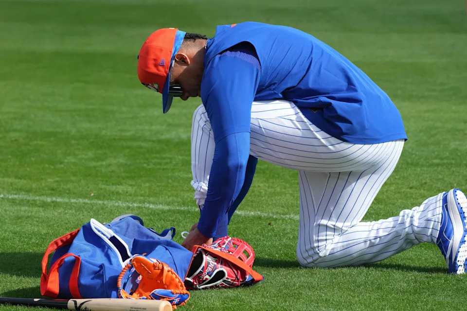Feb 16, 2026; Port St. Lucie, FL, USA; New York Mets right fielder Juan Soto (22) ties his shoe during spring training. Mandatory Credit: Jim Rassol-Imagn Images